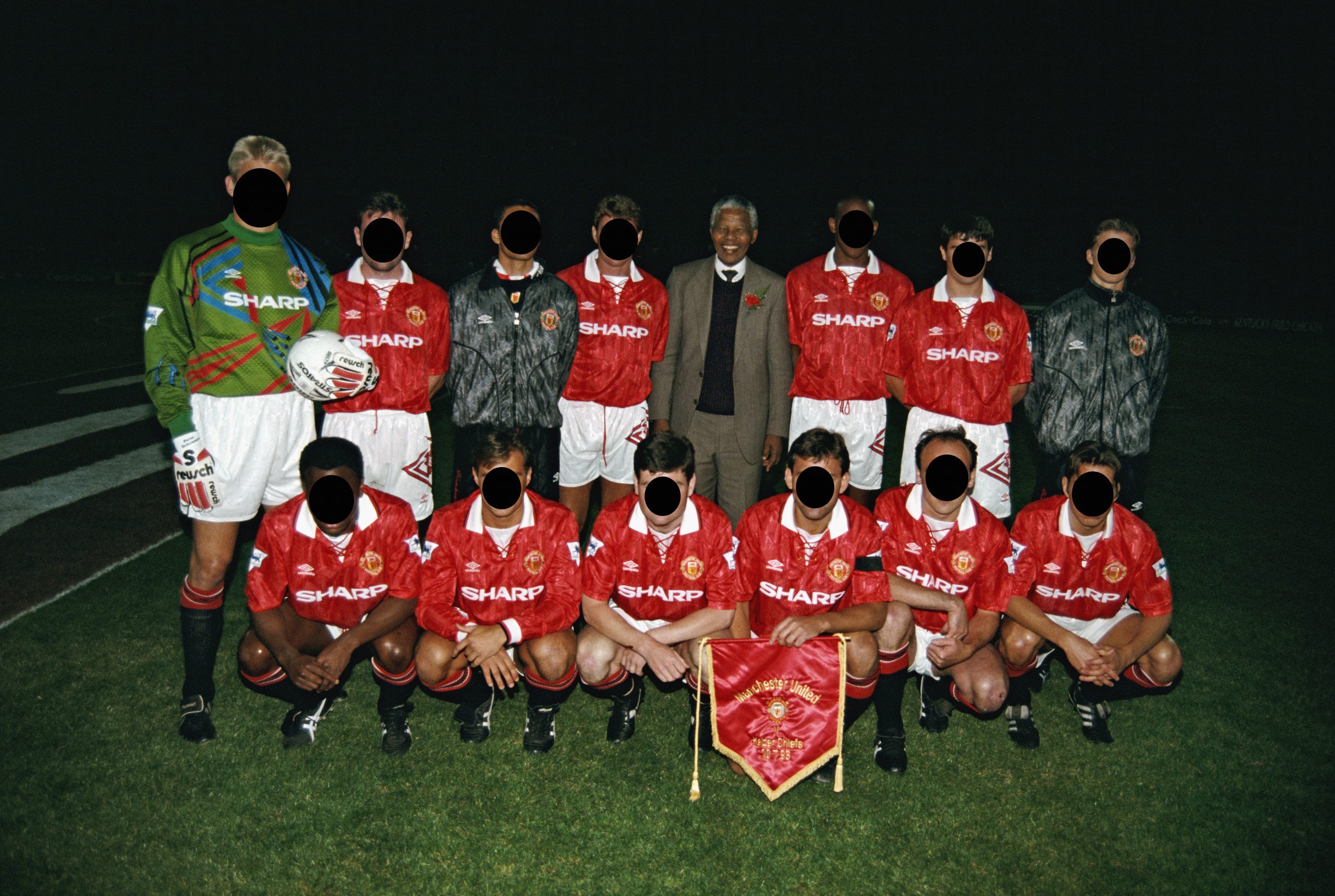 July 28, 1993 in Johannesburg, South Africa, Back Row Left to right Peter Schmeichel, Brian McClair, John O’Kane, Steve Bruce, Nelson Mandela, Dion Dublin, Roy Keane, David Beckham, Front Row Left to right Paul Parker, Clayton Blackmore, Denis Irwin, Bryan Robson, Mike Phelan and Darren Ferguson. if you got them all, very well done!