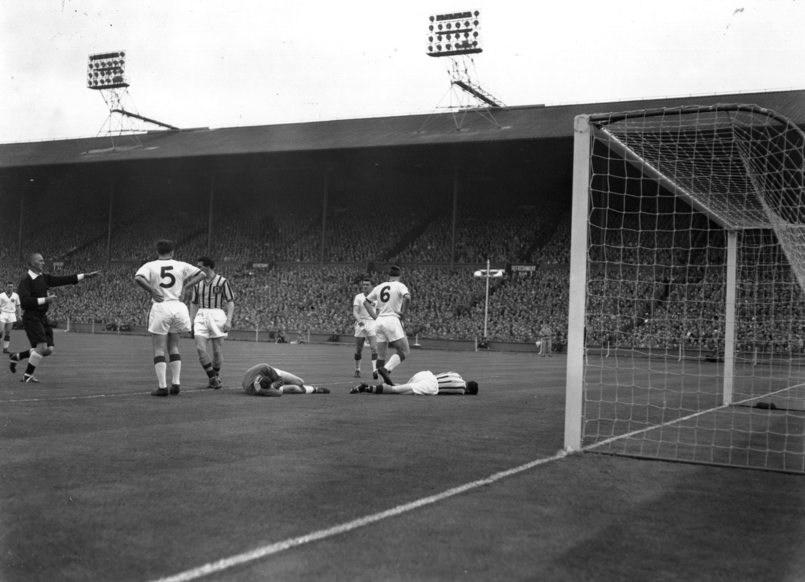 With just shy of 100,000 people inside the stadium, and the Wembley pitch looking like “a palace lawn”, the sides kicked off and soon the match was marred by huge controversy. In the sixth minute, as Ray Wood gathered the ball from a header, Villa striker Peter McParland collided with the United keeper and he immediately collapsed to the floor. The challenge was late and unnecessary and as both players lay prone on the ground, it soon became obvious that Wood was in bad shape. Despite being carried off on a stretcher, leaving United struggling with ten men, the brave keeper decided to come back on, playing on the right wing as Irishman Jackie Blanchflower deputised in goal.